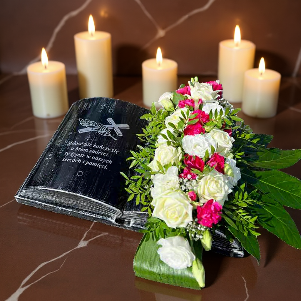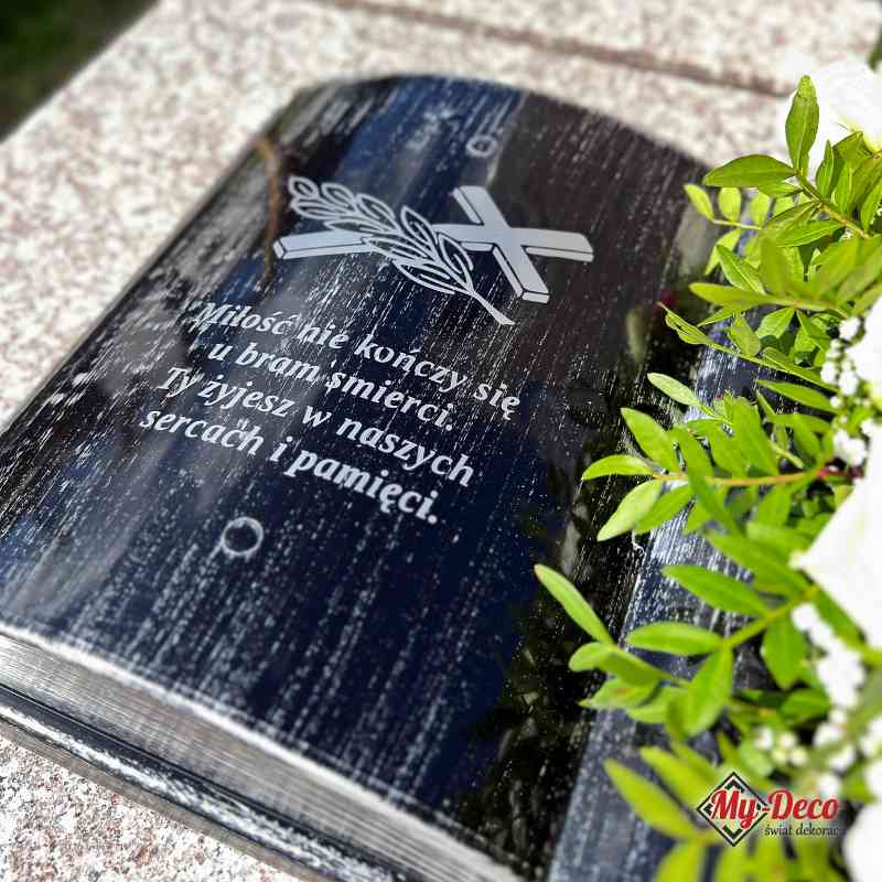 Wyraź szacunek i pamięć w elegancki sposób dzięki naszej czarno-srebrnej Księdze na grób. To nie jest zwykła dekoracja, lecz wyjątkowy symbol, który łączy tradycję z nowoczesnością. Srebrna sentencja, będąca centralnym punktem tej kompozycji, oddaje hołd tym, których kochamy, i przypomina o wiecznej więzi, która nie kończy się na cmentarzu. Prosty, ale wyrafinowany design idealnie pasuje do każdego pomnika, tworząc harmonijne i godne miejsce pamięci.