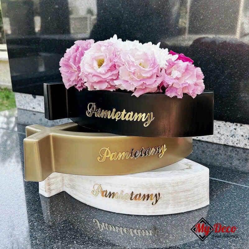 Ta doniczka na grób została wykonana z tworzywa sztucznego, co gwarantuje jej odporność na zmienne warunki atmosferyczne. Jest to istotna zaleta, ponieważ w przeciwieństwie do donic ceramicznych, nasza osłonka jest odporna na mróz i pęknięcia. Dzięki temu zachowa swój estetyczny wygląd przez wiele lat. Dodatkowym atutem jest lustrzany, złoty napis „Pamiętamy”, wykonany z pleksi, który nadaje całości luksusowego wyglądu. Odbijając światło, napis delikatnie lśni w słońcu, będąc pięknym symbolem pamięci i szacunku.