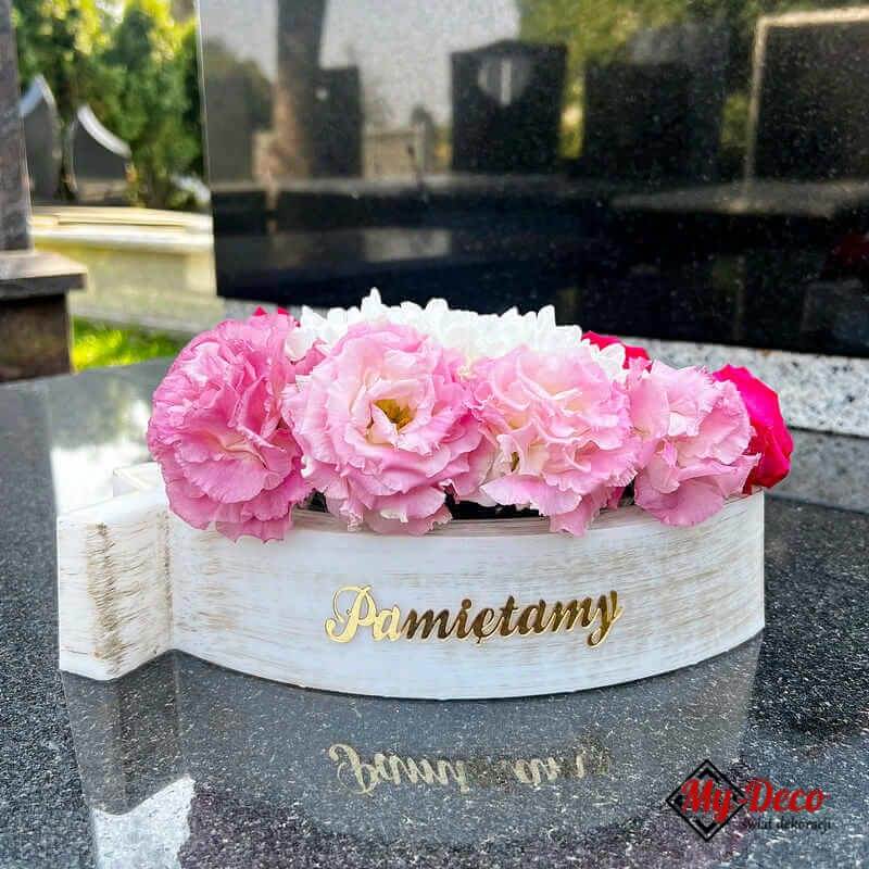 Cechą, która dodatkowo wyróżnia tę doniczkę, jest subtelny złoty napis Pamiętamy wykonany z pleksi lustrzanej. Ten elegancki detal nadaje doniczce luksusowy wygląd, a lustrzana powierzchnia odbija światło, co sprawia, że napis delikatnie błyszczy w słońcu. Taki akcent symbolizuje pamięć i szacunek, dodając grobowi wyjątkowego blasku i harmonii.