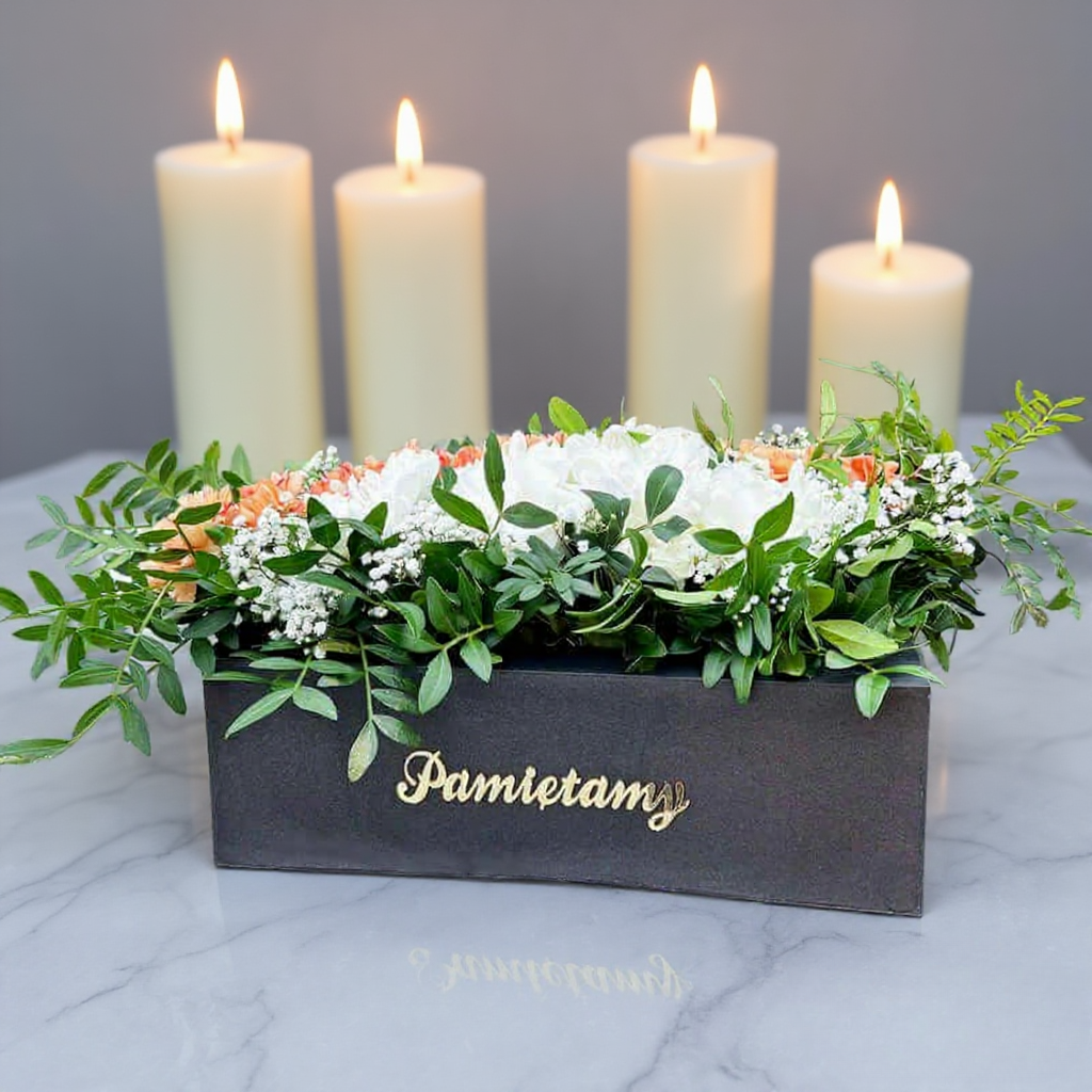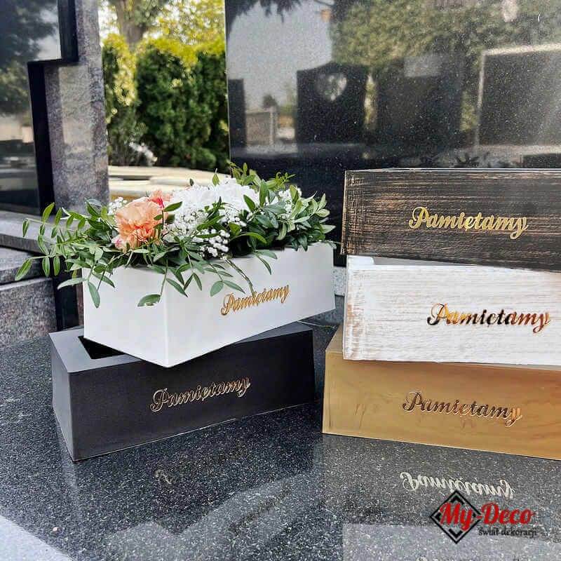 Cechą, która wyróżnia tę doniczkę, jest napis „Pamiętamy”, wykonany ze złotej lustrzanej pleksi, dającej subtelny efekt 3D. Ten elegancki detal nadaje ozdobie indywidualny charakter i jest pięknym symbolem szacunku oraz pamięci o zmarłych. Efekt trójwymiarowości przyciąga wzrok i czyni osłonkę na cmentarz wyjątkową dekoracją. Połączenie nowoczesnej estetyki z klasyczną formą sprawia, że jest to wyraz głębokiego szacunku, łączący funkcjonalność z symbolicznym hołdem.