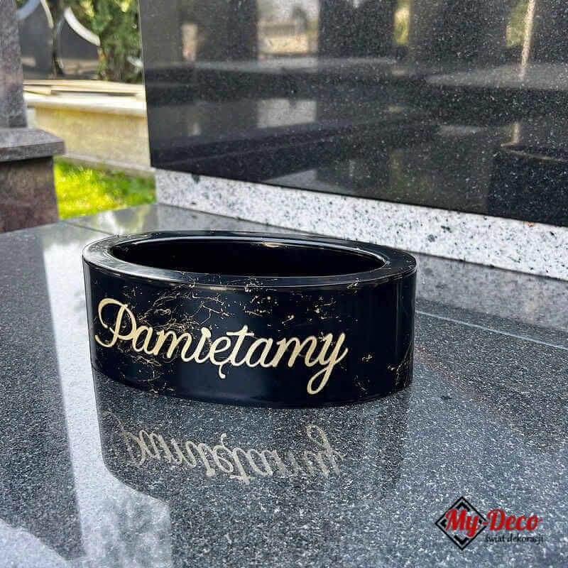 Doniczka ozdobna do kompozycji kwiatowych czarno złota ♥ z napisem Pamiętamy, dekoracja na cmenarz ♥