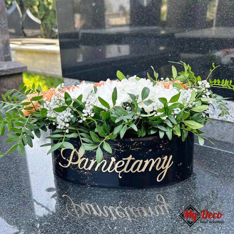 Jednym z najbardziej wyróżniających się elementów tej doniczki nagrobnej jest napis „Pamiętamy”, wykonany z laminatu, który tworzy subtelny efekt 3D. To elegancki detal, który nadaje doniczce indywidualny charakter i symbolizuje szacunek oraz troskę o pamięć zmarłych. Efekt 3D przyciąga wzrok i sprawia, że osłonka na cmentarz staje się wyjątkową ozdobą nagrobka.