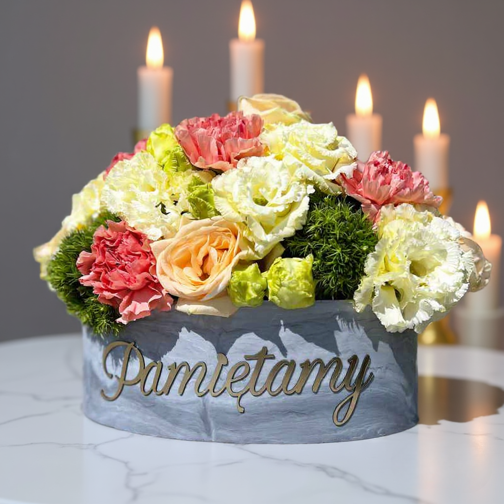 Doniczka ozdobna do kompozycji kwiatowych. Jeśli szukasz doniczki ozdobnej na kwiaty zarówno żywe jak i kompozycje sztuczną, która pozwoli Ci wyrazić uczucia wobec tych, którzy odeszli, jednocześnie będąc symbolem dbałości o detale i estetykę. Napis z laminatu Pamiętamy to niezwykły element, który przyciąga uwagę i podkreśla unikalność tego produktu.
