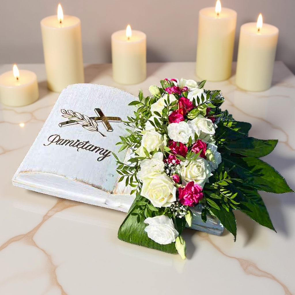 Prezentujemy wyjątkową kompozycję nagrobną, która łączy w sobie siłę tradycji z nowoczesnym designem. Nasza Biała Księga na Grób z eleganckim napisem „Pamiętamy” oraz złotym, lustrzanym krzyżem, jest idealnym sposobem na uczczenie pamięci bliskich. Złoty, lustrzany krzyż stanowi serce dekoracji, symbolizując wiarę i wieczną pamięć o tych, którzy odeszli. To nie tylko dekoracyjny stroik, ale przede wszystkim wyraz głębokich uczuć i wspomnień. Wykonana z dbałością o każdy detal, jest doskonałym wyborem dla tych, którzy pragną uczcić pamięć swoich bliskich w wyjątkowy sposób.