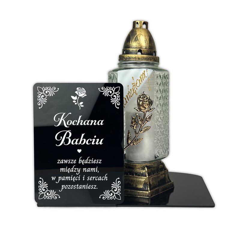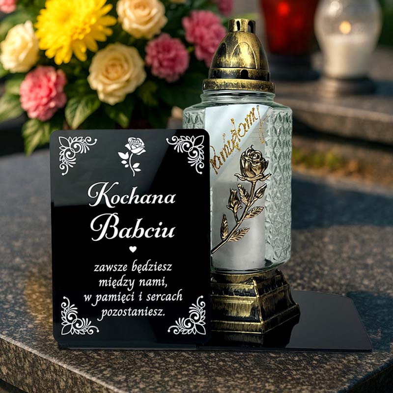 Podstawka Nagrobna na Cmentarz Czarna Pleksi z Dedykacją. Elegancka dekoracja na grób z miejscem na znicz. Idealna na Wszystkich Świętych i inne okazje.