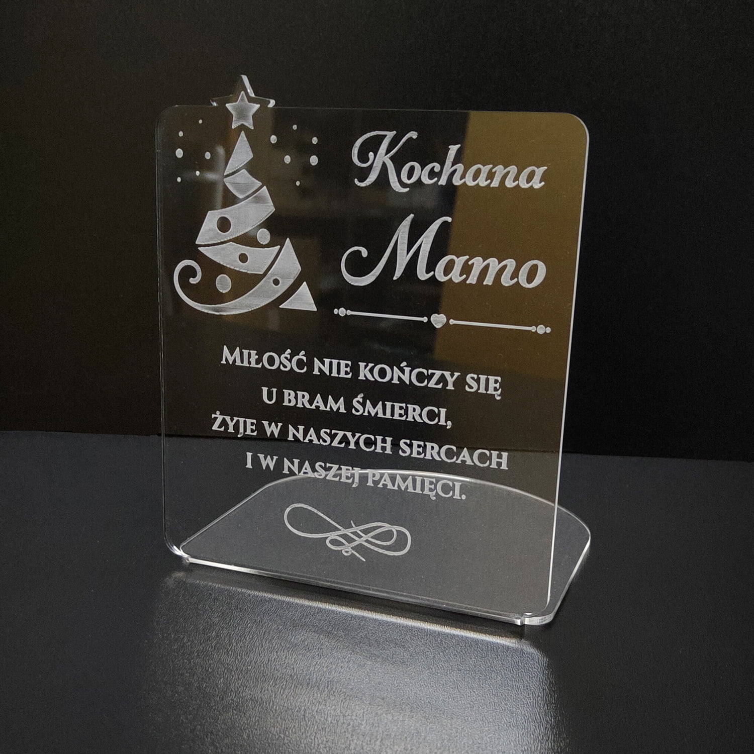 Upamiętnij swoich bliskich w wyjątkowy, świąteczny sposób. Nasza dekoracja nagrobna w kształcie tabliczki z motywem choinki, wykonana z wysokiej jakości nietłukącego szkła akrylowego (pleksi), to idealny wybór na Boże Narodzenie. Jej unikalny design, połączony z trwałością, sprawia, że jest to piękna i długowieczna ozdoba. Grawerowany w kolorze białym wzór choinki delikatnie rozświetla się blaskiem znicza, tworząc magiczną i spokojną atmosferę, idealną na Boże Narodzenie.