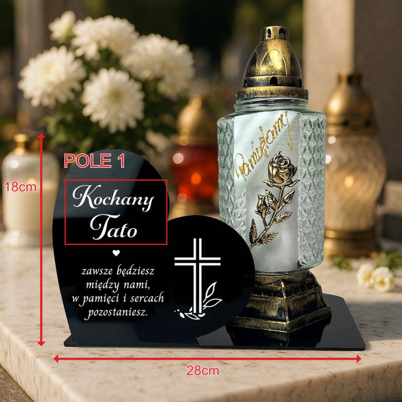 Statuetka nagrobna ma kształt serca o wymiarach 28×18 cm, co nadaje jej wyjątkowo symbolicznego charakteru i sprawia, że świetnie komponuje się z różnymi typami nagrobków. Ciemna, połyskująca powierzchnia pięknie eksponuje personalizowany nadruk UV, dodając całości głębi i szlachetności. W tylnej części znajduje się praktyczne miejsce na znicz – to funkcjonalne rozwiązanie, które łączy estetykę z użytkowością. Nadrukowana sentencja pozostaje niezmienna.