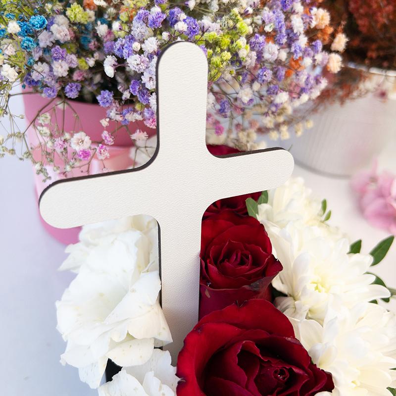 Topper ten można łatwo zamocować w różnych rodzajach kwiatowych aranżacji, zarówno naturalnych, jak i sztucznych, dzięki czemu każda wiązanka zyskuje elegancki i duchowy akcent. Wymiar 15×9,5 cm jest optymalny, aby topper nie przytłaczał kompozycji, ale jednocześnie był dobrze widoczny i wyrazisty.
